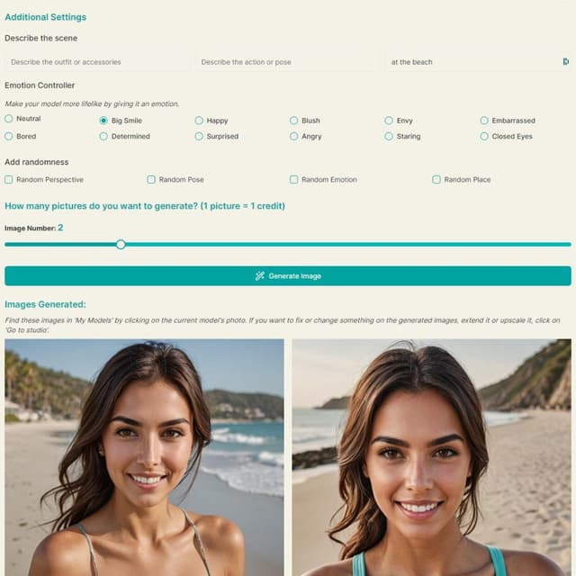 A simple tool optimised for desktop and mobileAll-in-one toolBlazing fast generationConsistent results, fine control (place, outfit, emotion, etc.)Import a photo to generate content featuring the personGet automated solutions for content generation in 2 clicksVirtual Wardrobe: Wear any clothes imported from a photoA studio to edit with AI your generated content or any uploaded pictureCreate stunning AI videos with your model's face in just a few clicksElevate Your Projects with Our AI Suite